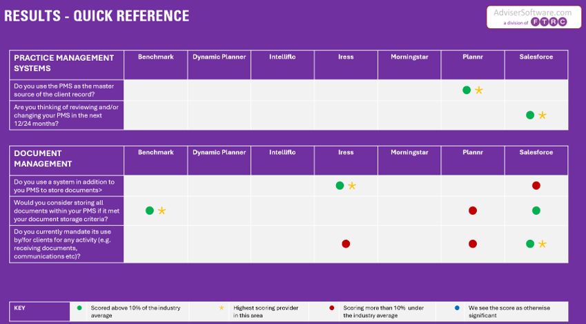 Through 120 pages of analysis, it compares how different systems are seen by their users and which are the strongest in different areas. This is then compared against the market average and each of the leading 7 key Adviser Technology vendors.